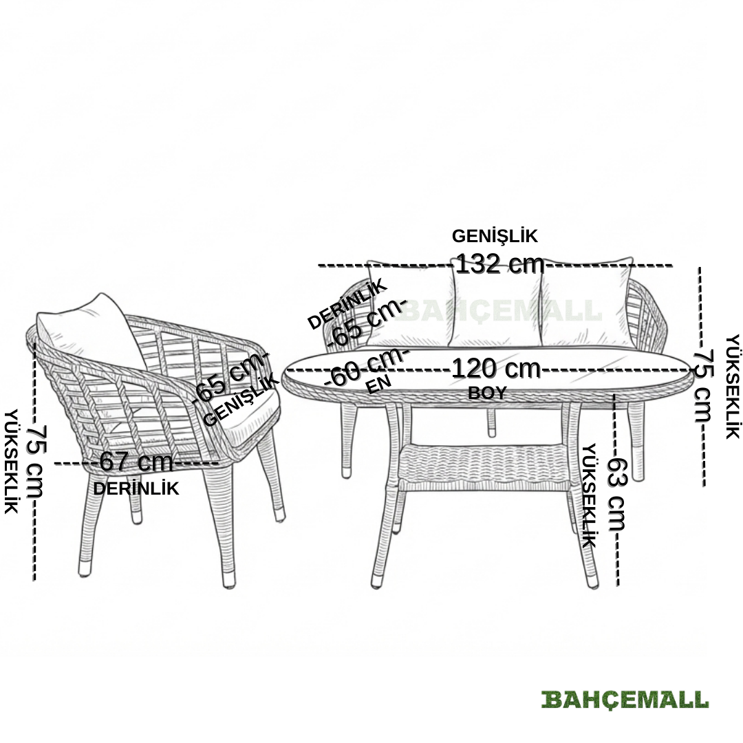 - 2'li Koltuk: Genişlik 132 x Derinlik 65 x Yükseklik 75 cm