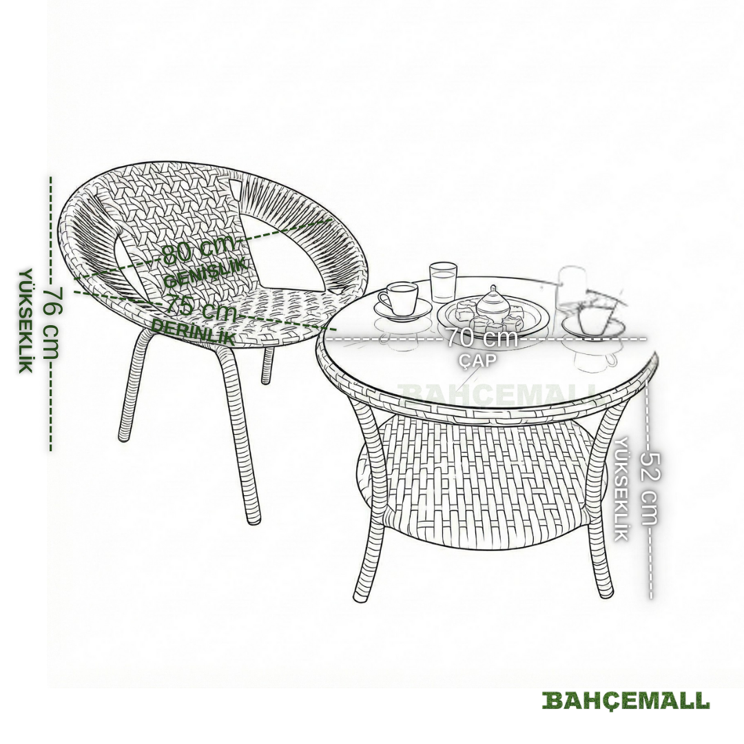 - Bu Merry Bahçe Mobilyası, bir adet Sehpa ve iki adet Tekli koltuktan oluşur.