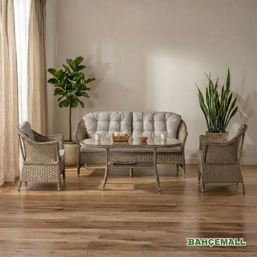 - Bu İdako Midi Bahçe Mobilyası, bir adet Sehpa ve iki adet Tekli ve bir adet Üçlü koltuktan oluşur.