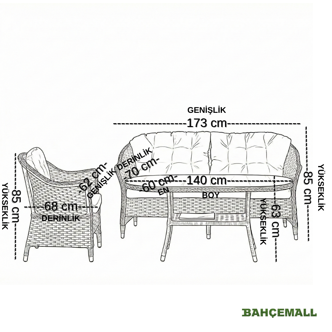 - 3'lü Koltuk: Genişlik 173 x Derinlik 68 x Yükseklik 85 cm