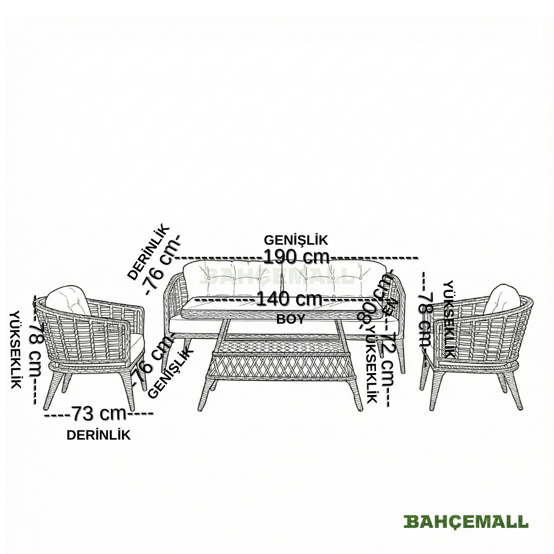 - 3'lü Koltuk: Genişlik 190 x Derinlik 76 x Yükseklik 78 cm