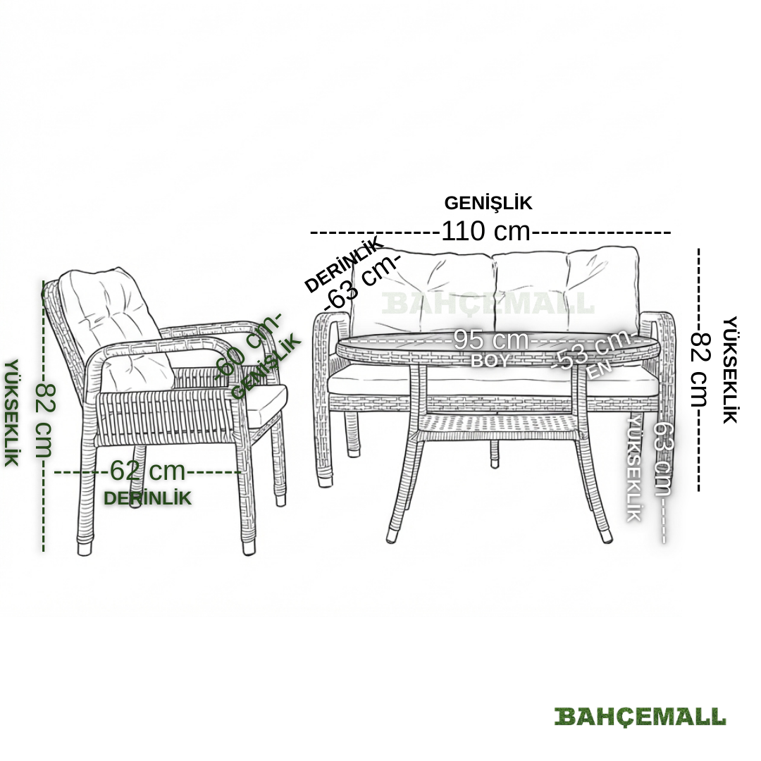 - 2'li Koltuk: Genişlik 110 x Derinlik 62 x Yükseklik 82 cm